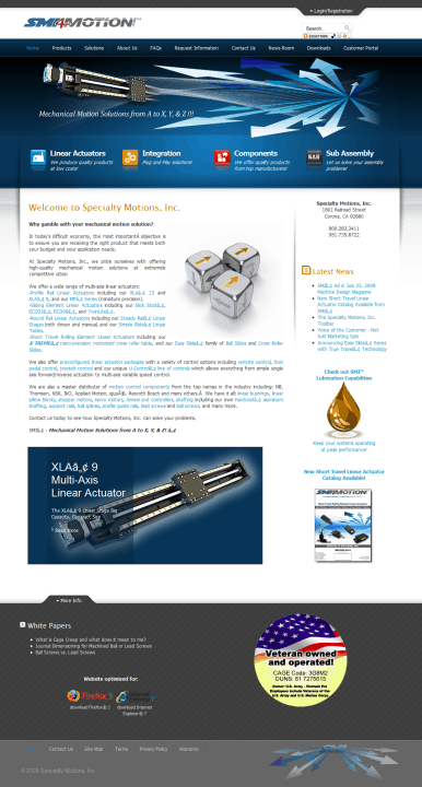 Speciaty Motions, Inc. is a manufacturer and distributor of linear motion control systems and components. Sean Downey of Blast Reach Communications filled the role of Marketing and Corporate Communications Management for the company handling everything marketing including: web site design/development, brand development, graphic design, product photography and press release writing.
